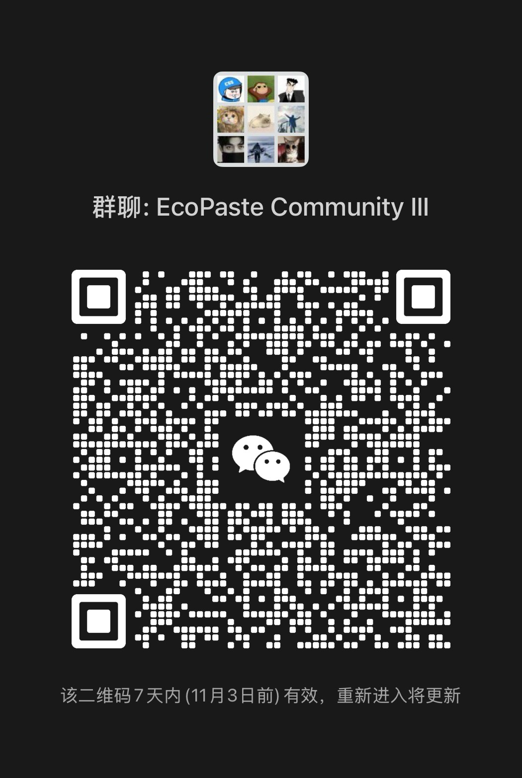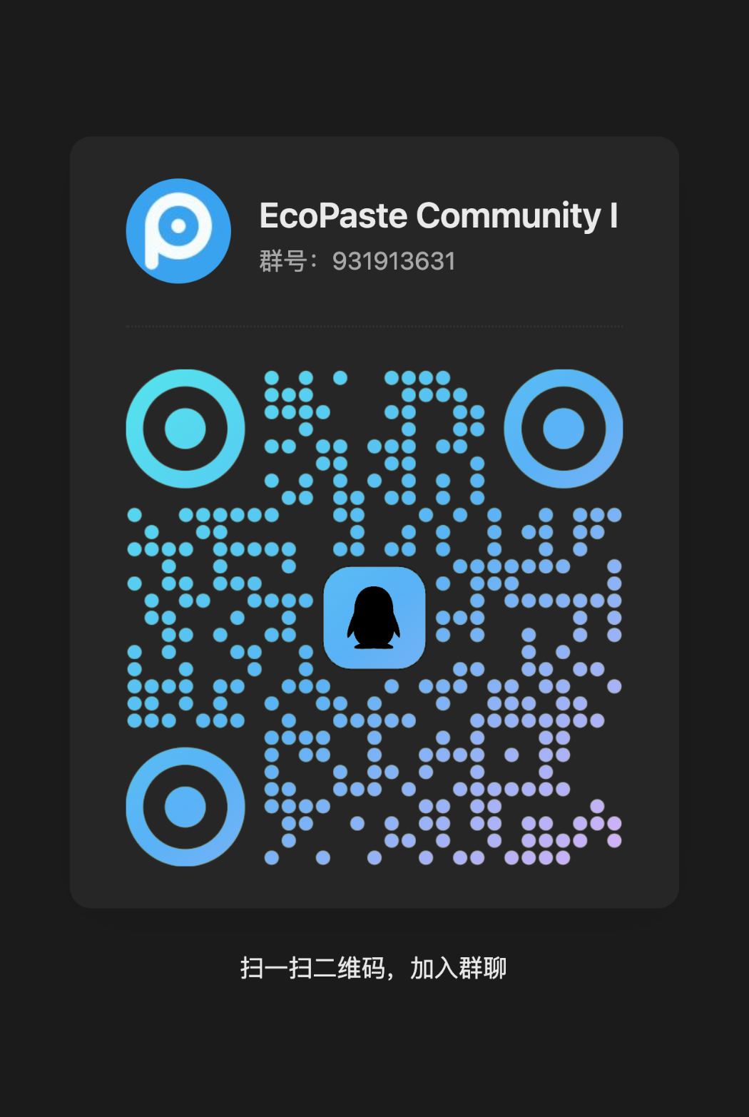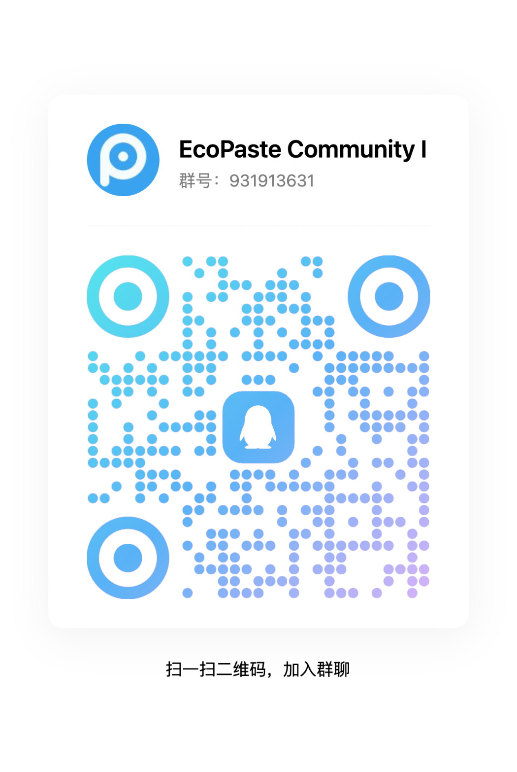 🎉 欢迎加入 EcoPaste 社区交流群!这里是大家交流经验、分享点滴的小天地,期待你的加入,一起畅所欲言~